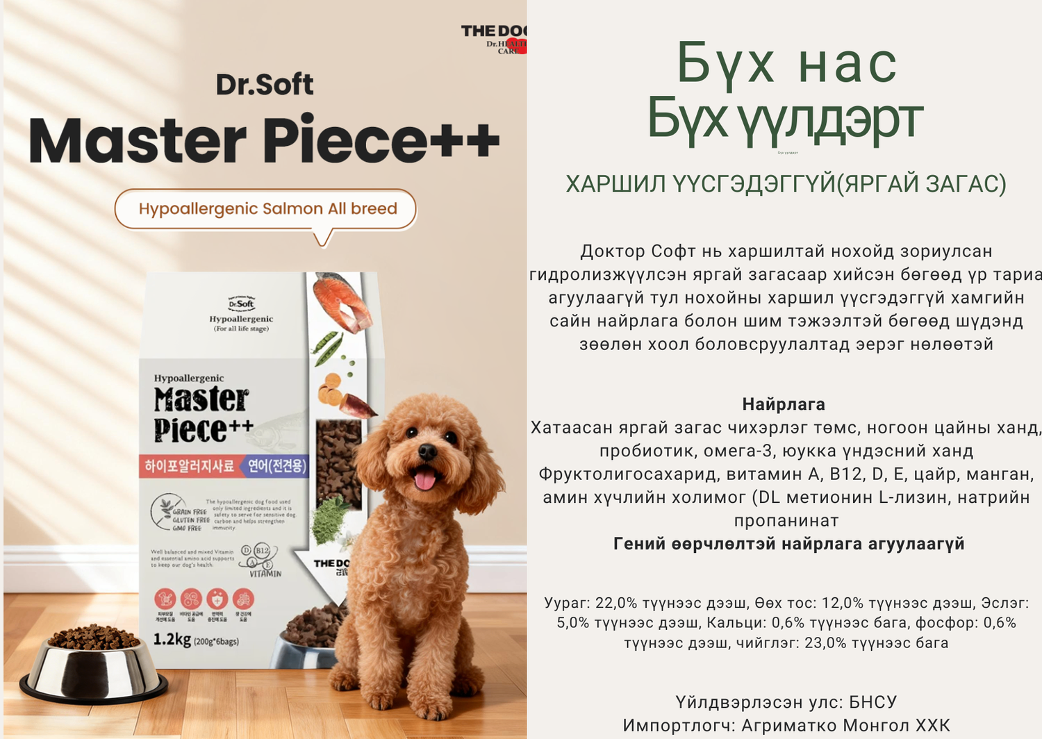 Доктор Софт нь харшилтай нохойд зориулсан гидролизжүүлсэн яргай загасаар хийсэн бөгөөд үр тариа агуулаагүй тул нохойны харшил үүсгэдэггүй хамгийн сайн найрлага болон шим тэжээлтэй бөгөөд шүдэнд зөөлөн хоол боловсруулалтад эерэг нөлөөтэй